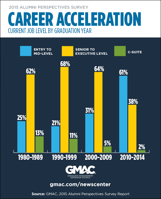 The majority of graduate business school alumni, working across all occupational levels from entry-level positions to c-suite, credit their graduate management education for preparing them for leadership positions, as well as for accelerating the pace of their career advancement. In addition, they report high levels of job satisfaction.