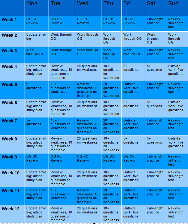 * I have you reviewing the entire OG before the final push; you should notice a difference in your performance by this point, and you also may well have been doing questions from other sources, so it’s good to re-ground yourself in the book by the makers of the test.
